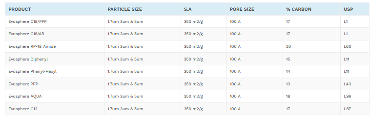 Evosphere columns are the very latest in HPLC particle technology. Incorporating our optimised bonding and packing practices with a fully porous monodisperse particle, providing the analyst with the ability to significantly increase efficiency and resolution over ‘traditional’ 3µ & 5µ particles.