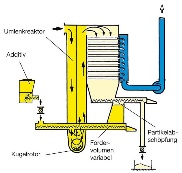 These can be bonded adsorptiv lyritly by adding additives such as calcium hydroxide Ca(OH)2 and / or activated carbon or stove coke in the raw gas stream adsorptiv and deposited in the subsequent tissue filter. With the LÜHR ball rotor, high sorption rates and exhaust gas separation levels are achieved.