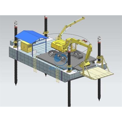 The Excavator pontoon is specially developed to support excavator working in water for hard layer dredging project. 3 pieces of positioning spuds are equiped to fix the pontoon in water. Diesel driven hydraulic syetem offers power to the pontoon.