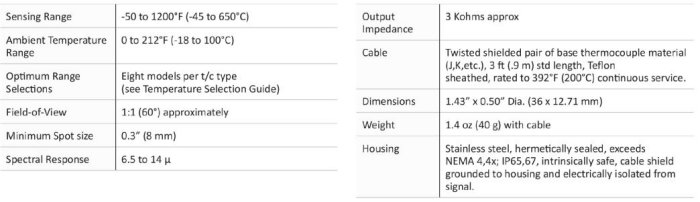The IRt/c.1X features: Infrared Thermocouple IRt/c. Non-contact. Self Powered. Intrinsically Safe. Repeatability 0.02°F (0.01°C). Interchangeability ±1%. Resolution approx. 0.0001°C. Small size.