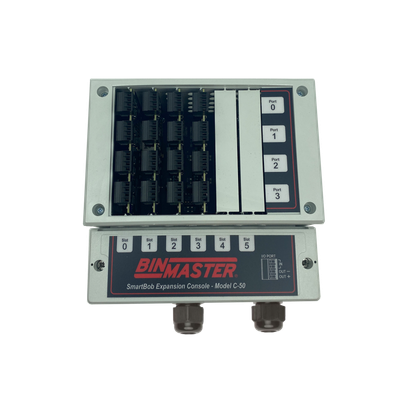 The C-50 analog expansion console interfaces with the C-100 SmartBob control console to provide multiple 4-20mA outputs, enabling monitoring of multiple bins equipped with SmartBob sensors from a single C-100 SmartBob console. The C-50 analog expansion console connects to the C-100 SmartBob console via a dedicated RS-485 cable. Then, the C-100 SmartBob console is connected via a daisy chained RS-485 network to monitor from 1 to 120 SmartBob sensors. Utilizing the C-50 analog expansion console to facilitate networking of SmartBob sensors reduces wiring and installation costs and enhances operational efficiency.
