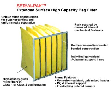 Purolator`s SERVA-PAK is an extended surface high capacity air filter composed of individual dust holding pockets assembled in a metal support frame. The SERVA-PAK header is manufactured from corrosion-resistant, galvanized metal. The frame features rigid internal support for the filter, and interlocking mitered corners. Read