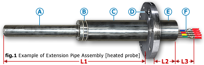 The complete Extension Assembly, shown above with a Heated Probe attached in location , consists of: an Extension Ring (when heated) or a basic Weld Adaptor (when unheated), an Extension Pipe, a Mounting Flange, an Overhang (aft protrusion of the extension pipe), and the 4pc. Extension Tube Set.