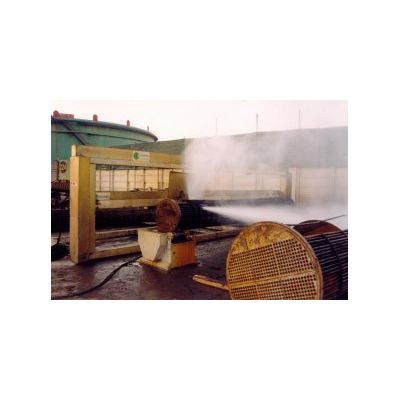- First Phase : a crane positions the tube bundle on the two rollers resting the flange on the motorised roller. The operator uses the controls to align the tube bundle and starts the water jet with the trolley moving longitudinally along the bundle.