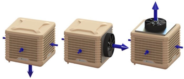 With a maximum flow rate of 14,000m3/hr EcoCoolers contain an inbuilt fan and evaporative cooling pads. This evaporative cooler is designed to be externally mounted and should be used as part of a mechanical ventilation system with a paired extract fan. The standard configuration is down flow, where air is supplied from the base of the cooler into the area that requires cooling.