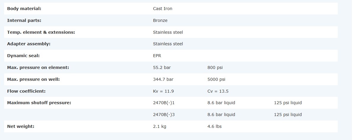 Closes with a rise in temperature above the set point and will open on falling temperature. With a valve seal of Nitrile rubber this unit, when fully closed, will withstand 8.6 bar (125 psi) water pressure without leaking, To obtain maximum life from the temperature elements the valve must not be operated continuously at more than 18˚C (30˚F) above the opening point. If it is necessary to operate at a continuous over temperature, consult the factory for alternative elements.