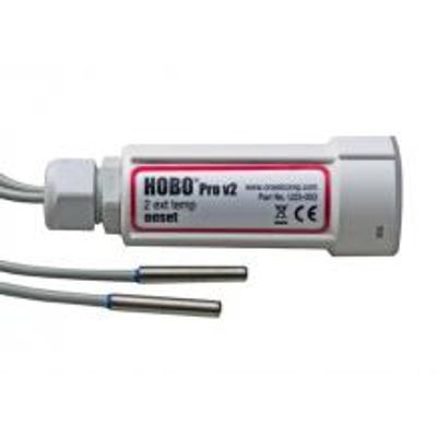 The HOBO Pro v2 2x External Temperature Data Logger is a weatherproof data logger with two external soil/water temperature probes on 6-foot cables for fast sensor response and deployment in tight spaces.