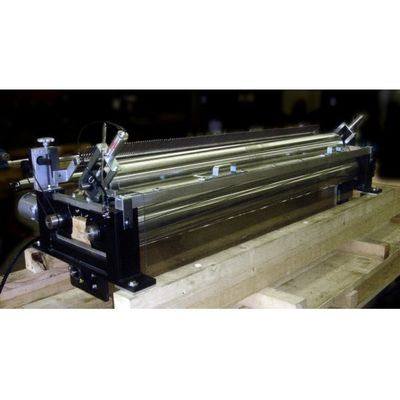 Self-Adjusting – Steady and equal cutting pressure maintanined by powerful air cylinders. Pressure is adjustable, easily set, and repeatable. Cutting force is automaticaly equal across the face of the working rolls. Compensation for wear of the rubber cot is automatic. Cutting pressure is clearly indicated on a gauge. Feed roll rests on Anvil Roll in a sliding guide. No need to adjust for wear.
