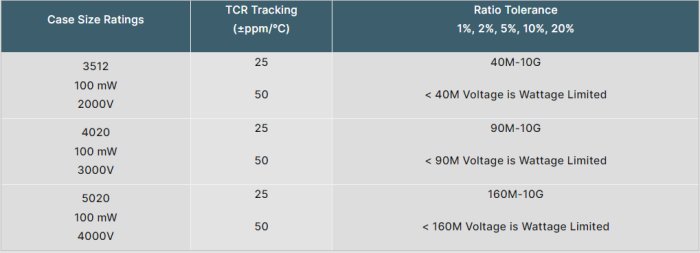 The High Voltage Chip Dividers (HVCD Series) from Exxelia Ohmcraft leverage advanced Micropen® precision printing technology to deliver superior performance in thick-film high voltage surface mount dividers. The serpentine patterned dividers crafted with this technology exhibit precise electrical characteristics essential for various high voltage applications. The HVCD series offers a range of electrical specifications, including TCR tracking within ±ppm/°C and resistance ratio tolerances of 1%, 2%, 5%, 10%, and 20%. Absolute TCR is maintained below 100 ppm/°C, and total resistance tolerance is ±15% (with ±20% for values over 10GΩ). These resistors are designed with a resistive element made from thick film on a 96% alumina substrate, and encapsulated with epoxy. Termination options include tin over nickel barrier or lead solder over nickel barrier. Custom sizes and configurations are available upon request to meet specific needs. Packaging includes bulk, tape & reel, or flat packs that comply with EIA-481 tape and reel specifications.Our patented Micropen® precision printing technology provides superior precision, thick-film high voltage surface mount dividers. Exxelia Ohmcraft’s Micropenned serpentine patterned dividers produce superior electrical characteristics: