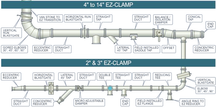 Installation time of a PSP® system using EZ- clamps is significantly reduced. The EZ-Clamp system is the most labor efficient, high performance duct system available. PSP installations use half of the labor of FRP system installations, and unlike FRP and "glued" plastic systems, there is no need for grinding, sanding, prep work or the use of malodorous epoxies and heating blankets, which especially important in the cleanroom setting. Using the EZ-Clamp joining system can save an additional 40% labor over other PSP® joining systems. EZ- clamp duct and fittings have the ability to be field modified (shortened, add nozzles or drain ports) and the stainless steel exterior will never need painting.