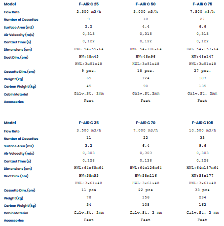 - Carbon filter transition surface area for each 2,500 m3 / h flow rate is 2 m2 (+ 0,05 m2), transition speed 0,32 m / s (+ -0,03 m / s)