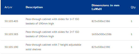 The pass-through cabinets with slides can standard accommodate ISO baskets of 600x400mm with a maximum height of 190mm. They have a capacity for either 1×7 baskets or 2×7 baskets.