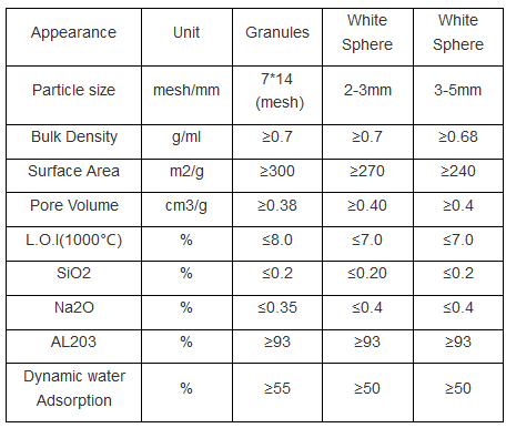 Peroxide Grade Aluminas are White sphere, odorless, tasteless, non-toxic, insoluble in water and alcohol, regular particle size, smooth at surface, with high mechanical strength and strong Adsorption of moisture, not expanding and cracking after adsorbing water, original shape kept. Chemical Formula : AI2O3.