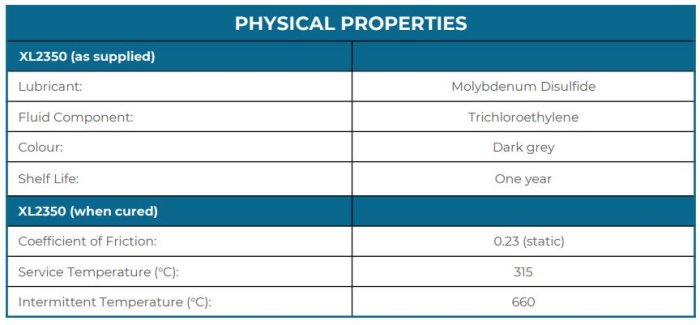 XL2350 offers excellent extreme pressure dry film lubrication. This specially processed long wearing molybdenum disulfide coating material air dries at room temperatures in five to ten minutes.