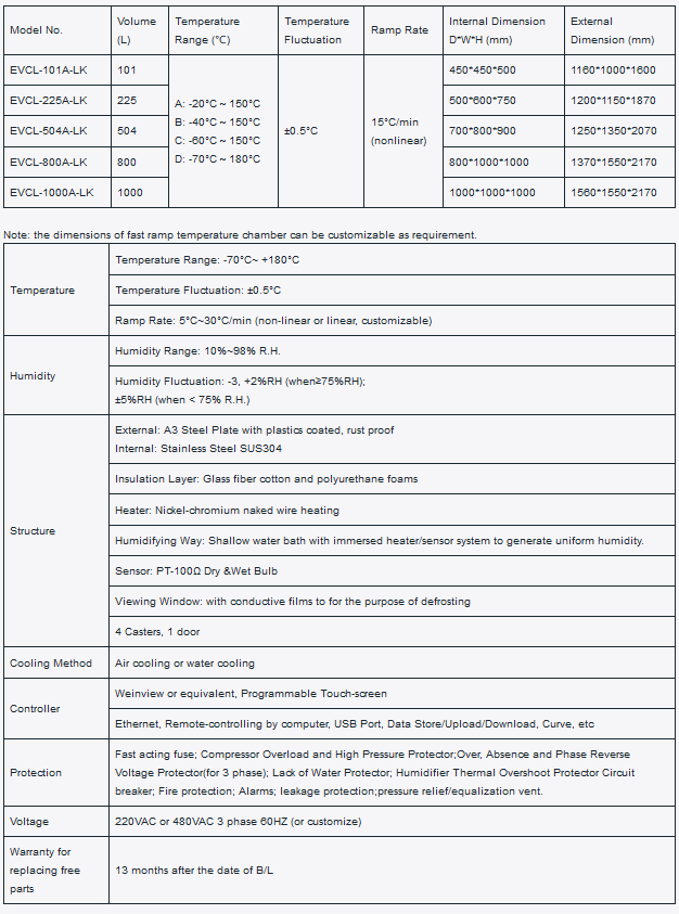 The Fast Ramp Temperature Chamber simulates an extreme environment in which temperature ramps up and down very quickly in a short time. It is used to test the reliability of electronics, automotive parts, military devices in the temperature fast changing environment, to evaluate the performance of test samples and to improve their reliability.