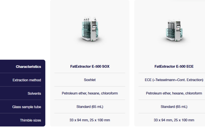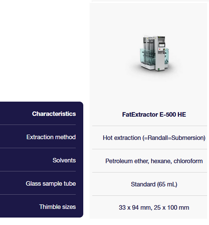 Quick and compliant. The FatExtractor E-500 is designed for quick and compliant fat extraction. Readily adapt your FatExtractor E-500 to changing needs with the interchangeable glass assembly and execute extractions according to Soxhlet, Randall or Twisselmann.