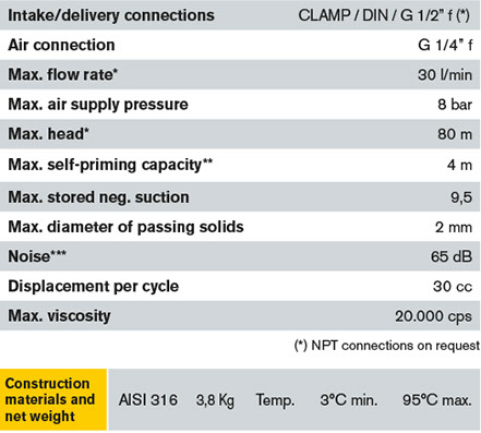 FDA Foodboxer 30 diaphragm pumps are characterized by exceptional performance, power and strength, making them ideal for pumping liquids with high apparent viscosity even if containing suspended solids. The stall-prevention pneumatic system assures a safe pump running and it does not need lubricated air. Self-priming dry capacity even with considerable suction head, fine tuning of speed without pressure loss and the possibility of dry operation without suffering damage mean that these pumps offer unrivalled versatility. In addition, the huge choice of construction materials allows selection of optimum chemical compatibility with the fluid and/or environment without neglecting the temperature range. They are specifically designed for demanding applications with high humidity or in potentially explosive atmospheres (ATEX certification).