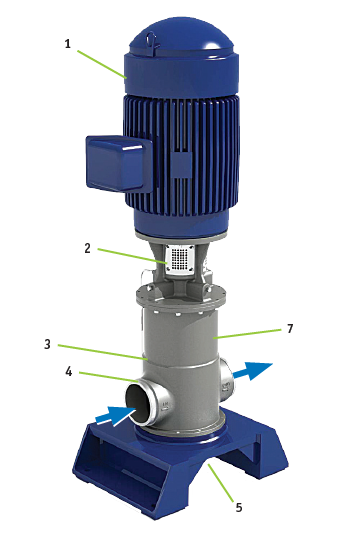 - Motor – rated for VFD usage, vertical operation, TEFC, NEMA or IEC frame
