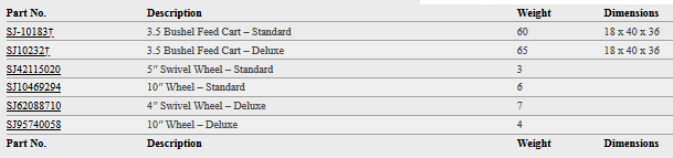 Feed carts come equipped with a polyethylene feed container with a capacity of 3.5 bushels. The steel base comes assembled with rubber wheels that can be upgraded to the deluxe model.