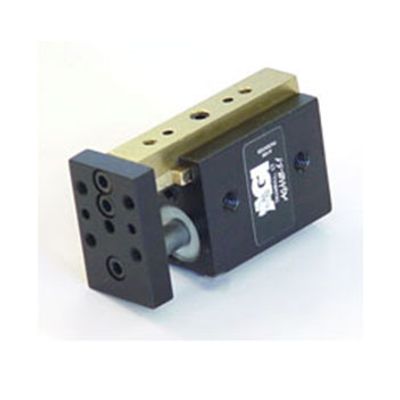 The AGMS-1-1 Feed Escapement - Single Finger is a mini pneumatic actuator designed for automation processes requiring precise control of feed tasks. It features a built-in air cylinder with a T-slot slide design and offers a stroke of 0.5 inches (12.7 mm). With a thrust force of 15 lbs (66.7 N) when extended and 13 lbs (57.8 N) when retracted, the actuator operates effectively at pressures ranging from 20 to 120 PSI (1.4 to 8 BAR). The temperature compatibility ranges from -20°F to 150°F (-28°C to 80°C), and it maintains a low side play of ±0.001 inches (0.03 mm). The actuator is constructed from high-strength aluminum alloys and bronze, ensuring durability and lightweight handling of 2.5 oz (70.1 g). Ideal for precise applications, it supports a maximum payload of 3 lbs (1.3 kg) and operates at speeds between 2 and 12 inches per second (0.5 to 3 m/sec).