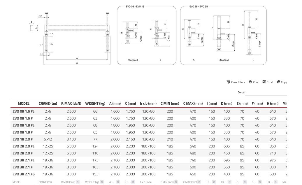 Additional stabilizers, with adjustable jacks and available with different cylinder lengths. The fixed models are not laterally extendable. On EVO 08 and EVO 18 models, swiveling plastic feet are provided as standard. On models from EVO 28 onwards, swiveling steel feet are included as standard.