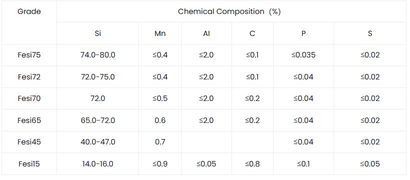 Chemical Composition of FeSi: Si, Al, Ca, Mn, Cr, P, S, C, Fe, and other elements.