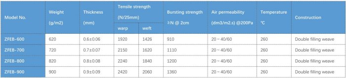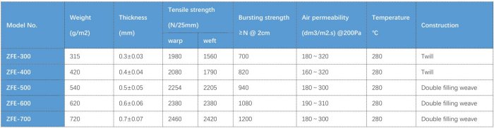 Typical technical specifications of the fiber glass filter fabric from Zonel Filtech(after finish treatment):