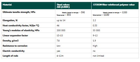 When it comes to a justifying calculation, Ultimate tensile strength, being one of the main characteristics of rebars, gives economical and process benefit at reinforcing a civil structure through substituting metal rebars for equally strong STEKON fiber-reinforced polymer rebar of minor diameter (examples provided in a comparative table below):