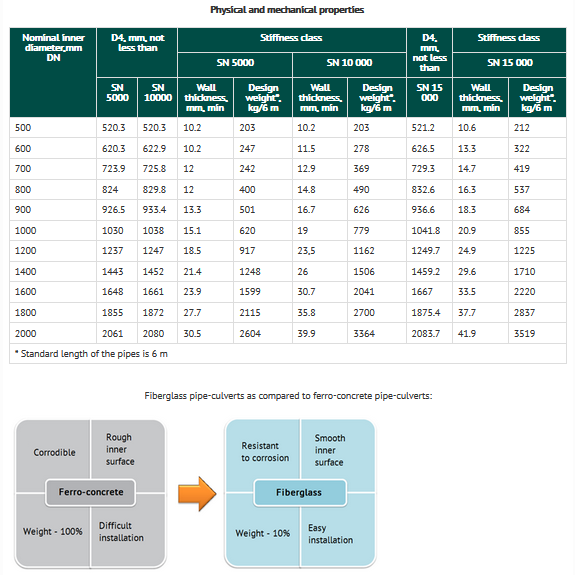 Typical application: fiberglass pipe-culverts are used when constructing new flow-through structures or repairing existent structures with operating temperature ranging from -50°Сto +60°С.