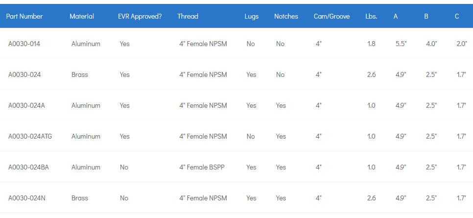 The Emco Wheaton A0030 Fill Adapter is designed for use with conventional dual point fill systems. Features recessed threads for easy installation and positive seating on riser pipes. Use with the A0097 Fill Cap. Notched variants are for use with the A0032-001 Adapter Clamp and comply with EPA 40 CFR Part 63 requirements.