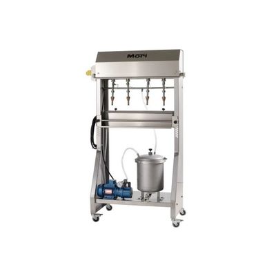 • Made of AISI 304 stainless steel with wheels. Articulated dispensers to facilitate the insertion and extraction of the bottles, height adjustment and filling level. Complete with 0.37 single-phase or three-phase, vacuum pump electrical system according to standards. Acts to filling of bottles from 0.25 to 5 litres.