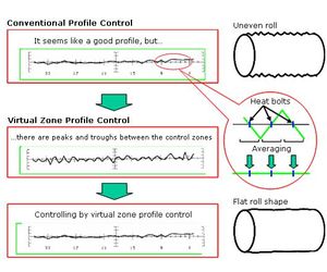 Virtual zone profile control has already achieved satisfactory results in many processes. It generates profiles at the midpoint between real bolts as well as on these bolts to perform control calculation. This prevents the occurrence of profile peaks and troughs between the bolts, which often become a problem in conventional profile controls only intended for profiles on the bolts. (Yokogawa patents)