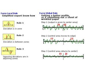 Expert fuzzy control based on fuzzy logic incorporates the manual bolt operation expertise of experienced machinery operators. This control method is effective with machines (mainly bi-axially oriented machines) where there is low repeatability of profile response to bolt manipulations, realizing more stable control than conventional control methods. Expert fuzzy control employs the concept of the virtual zone.