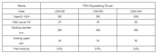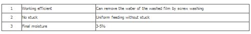 It equipped with screw system. Using special gearbox. And it works automatic. The final moisture of this machine is 3-5%. The capacity can be designed according to customer’s requirements. Compare with original dewater and pipe drier, The Film Squeezing dryer can save about 100KW per hour for you also make you get better quality product.