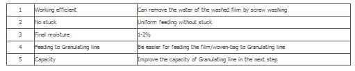Film Squeezing& Pelletizing dryer removes the water by screw pushing and electrical magnetic heating. The screw barrel is made of material feeding barrel, compressing barrel and plasticized barrel. After feeding, squeezing ,the film will be plasticized and cut to particle by the pelletizer which is installed besides the mold.