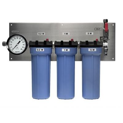 Features & Benefits: Compact stainless steel panel mount assembly. 3-step filteration (5, 1 and 0.2 micron). 10" high capacity filters. Inlet shut-off valve for easy servicing. Injection port for filter sanitization. Pressure gauge located after the filters.