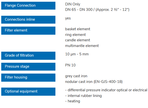 The simplex filter type 1.03.2 consists of one filter chamber and is for use in all circumstances where the plant or filter can be easily shut off by means of a shut-off valve to allow cleaning or replacement of filter elements.
