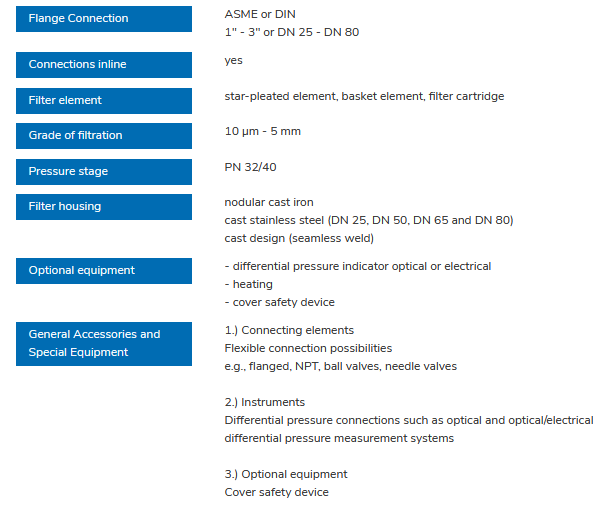 The simplex filter Type 1.12.2 is a particle filter for water and oil. For filtration of liquids, it is installed in the suction or pressure lines and, thus, protects the following parts of the system, for example, pumps, bearings, heat exchangers, valves or pipelines against contamination and silting.