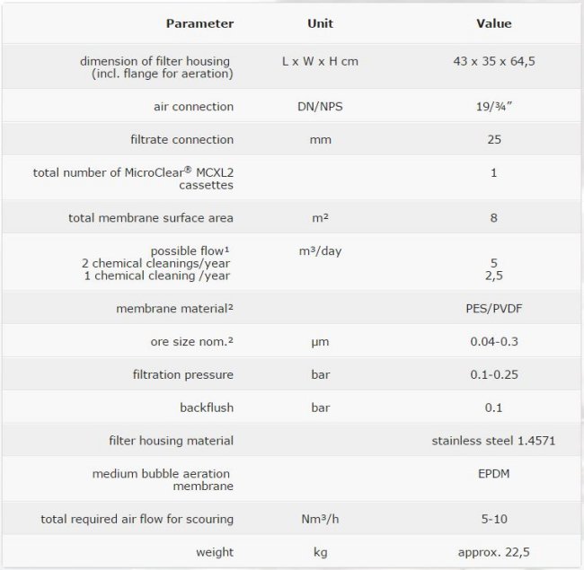 Complete assembled units for biological wastewater treatment with submerged membrane cassettes, including: Membrane cassettes MicroClear MCXL2. Filter housing made of stainless steel 1.4571. Membrane plate diffusor for medium bubble aeration in the filtration tank optimized for the plate distance of the MicroClear filters.