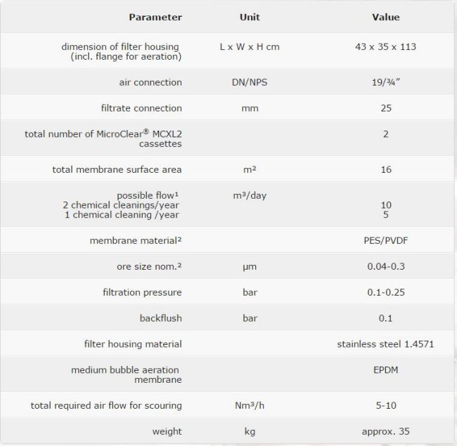 Complete assembled units for biological wastewater treatment with submerged membrane cassettes, including: Membrane cassettes MicroClear MCXL2. Filter housing made of stainless steel 1.4571. Membrane plate diffusor for medium bubble aeration in the filtration tank optimized for the plate distance of the MicroClear filters.