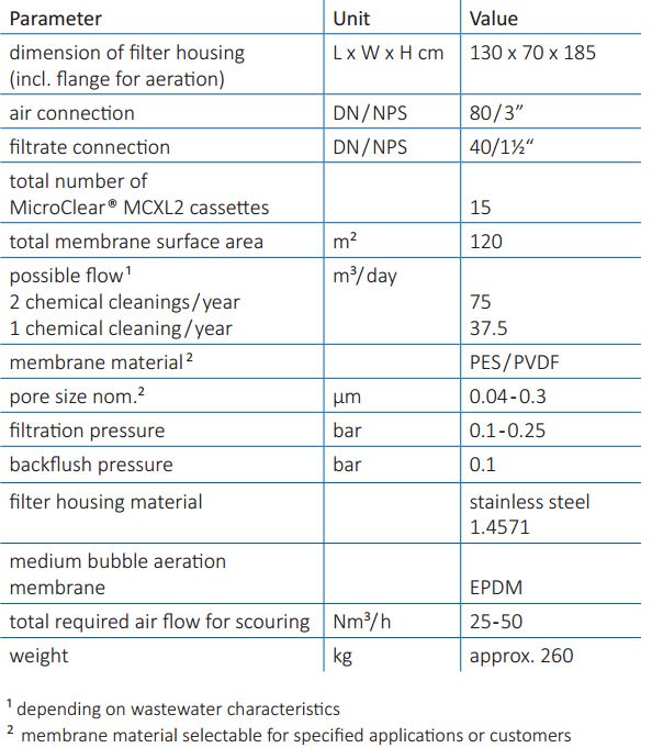 Complete assembled units for biological wastewater treatment with submerged membrane cassettes, including: Membrane cassettes MicroClear MCXL2. Filter housing made of stainless steel 1.4571. Membrane tube diffusor for medium bubble aeration in the filtration tank optimized for the plate distance of the MicroClear filters.