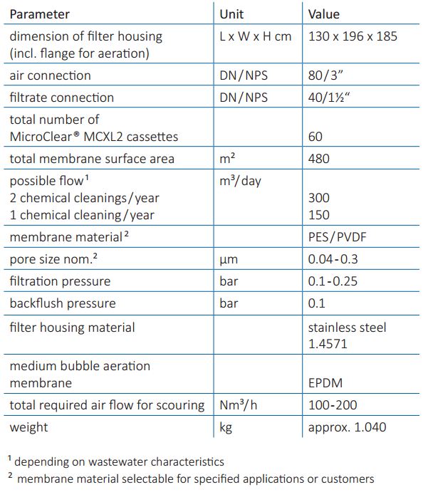Complete assembled units for biological wastewater treatment with submerged membrane cassettes, including: Membrane cassettes MicroClear MCXL2. Filter housing made of stainless steel 1.4571. Membrane tube diffusor for medium bubble aeration in the filtration tank optimized for the plate distance of the MicroClear filters.