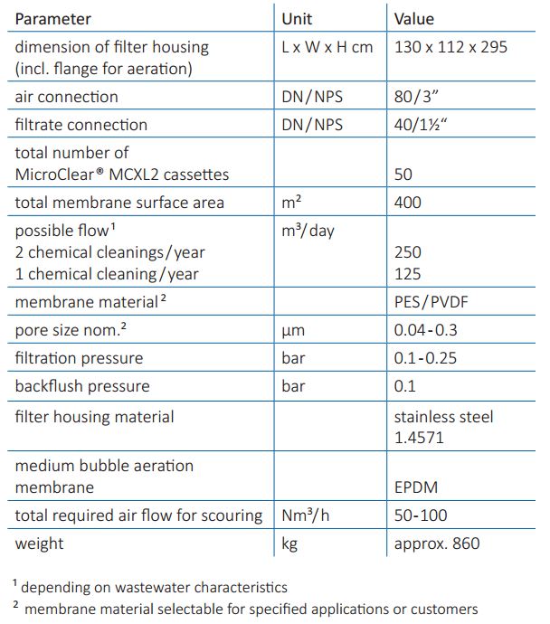 Complete assembled units for biological wastewater treatment with submerged membrane cassettes, including: Membrane cassettes MicroClear MCXL2. Filter housing made of stainless steel 1.4571. Membrane tube diffusor for medium bubble aeration in the filtration tank optimized for the plate distance of the MicroClear filters.