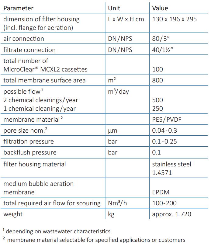 Complete assembled units for biological wastewater treatment with submerged membrane cassettes, including: Membrane cassettes MicroClear MCXL2. Filter housing made of stainless steel 1.4571. Membrane tube diffusor for medium bubble aeration in the filtration tank optimized for the plate distance of the MicroClear filters.