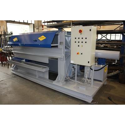 Main technical features: N1 Frame made of HEA 200 beams joined by welds. N°2 Box-like fixed heads made in thick sheet, joined by TIG welds. N°1 Mobile head having the same characteristics of the fixed ones, sliding on treated steel castors and guides made from the tie rods that connect the fixed heads. N°1 Hydraulic cylinder Ø200 mm. N°1 Hydraulic gearbox, 7.5 kW and maximum pressure of 200 Bar. N°1 Laminar bundle consisting in a minimum of 6 plates with a maximum pressure of 16 bar, made in polypropylene and coated with polypropylene filtering elements. Plants can be customised in terms of number of plates fitted on the laminar bundle.