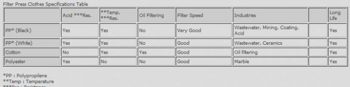 Filtrate quality depens on the quality of filter cloths. Main types of Filter Press Cloths according to raw materials;