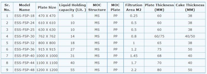 Filter Press with Electro Mechanical Plate Shifting Device : It is Mechanised Recessed Plates type Filter Press of SIZES varies from 355 mm x 355 mm to 1200 mmx1200 mm for 7 bar Filtration Pressure with and without hydraulic closing devices. Moc of Skeleton : Cast Iron or Mild Steel. Moc of Filter Element : Polypropylene Cast Iron, SS 304, SS 316.