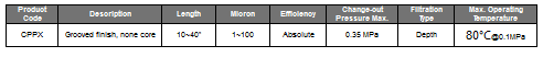 Comparing to standard PP melt-blown cartridges, CPPX Cartridges` Grooved Finishing increased the cartridge filter surface area by 60%, and flow rate by 20%, greatly improved dirt holding capacity as well as operating efficiency. Singed inner core surface, singed exterior treatment to prevent loose fiber migration. Continuous length is available. Graded pore depth filter media type. No core lining required.