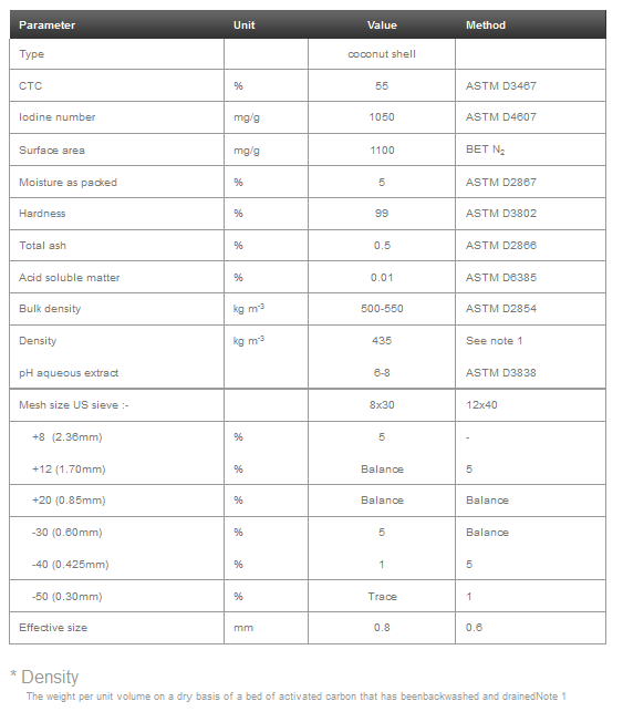 A range of granular activated carbons manufactured from specially selected grades of coconut shells. The material is manufactured under stringently controlled conditions by steam activation, to produce a porous adsorbent with a highly developed internal surface area. Acid washing followed by neutralisation is then undertaken to remove soluble mineral constituents from the matrix of the activated carbon, producing an adsorbent of exceptional purity.