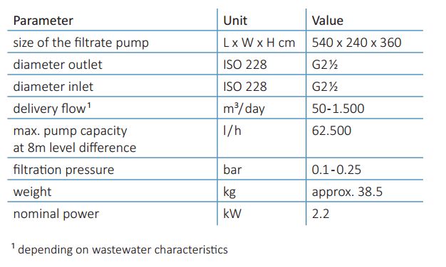 Complete preassembled filtrate extraction unit consisting of: self priming permeate pump, pressure gauge, frequency inverter, vacuum pressure sensor. The FA-1500 is suitable for filter housing: MB5-5, in parallel connected filter housings of the MB-filter housing series, MX500-C, MX500-D.
